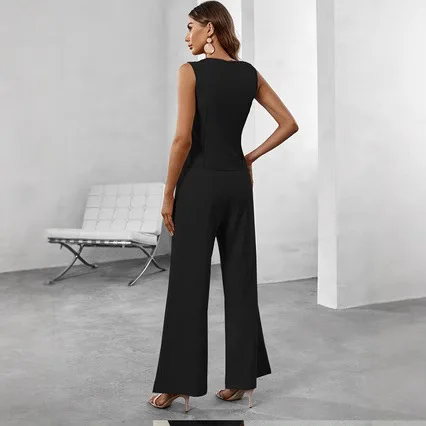 Detta set består av en ärmlös väst med knäppning framtill och byxor med hög midja och vid siluett. Kombinationen skapar en sammanhängande outfit som passar för arbete, möten och sociala tillfällen. Delarna kan bäras tillsammans eller kombineras med andra plagg i garderoben.