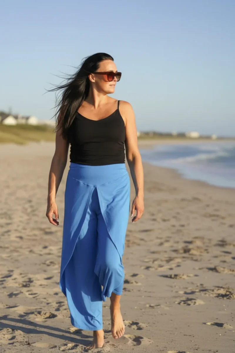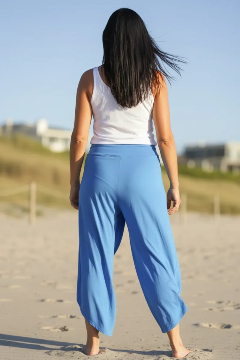 Elegant och sval byxa i silkesmjuk viskos. Lager av tyg och midjan har bred mudd framtill och resår baktill.
