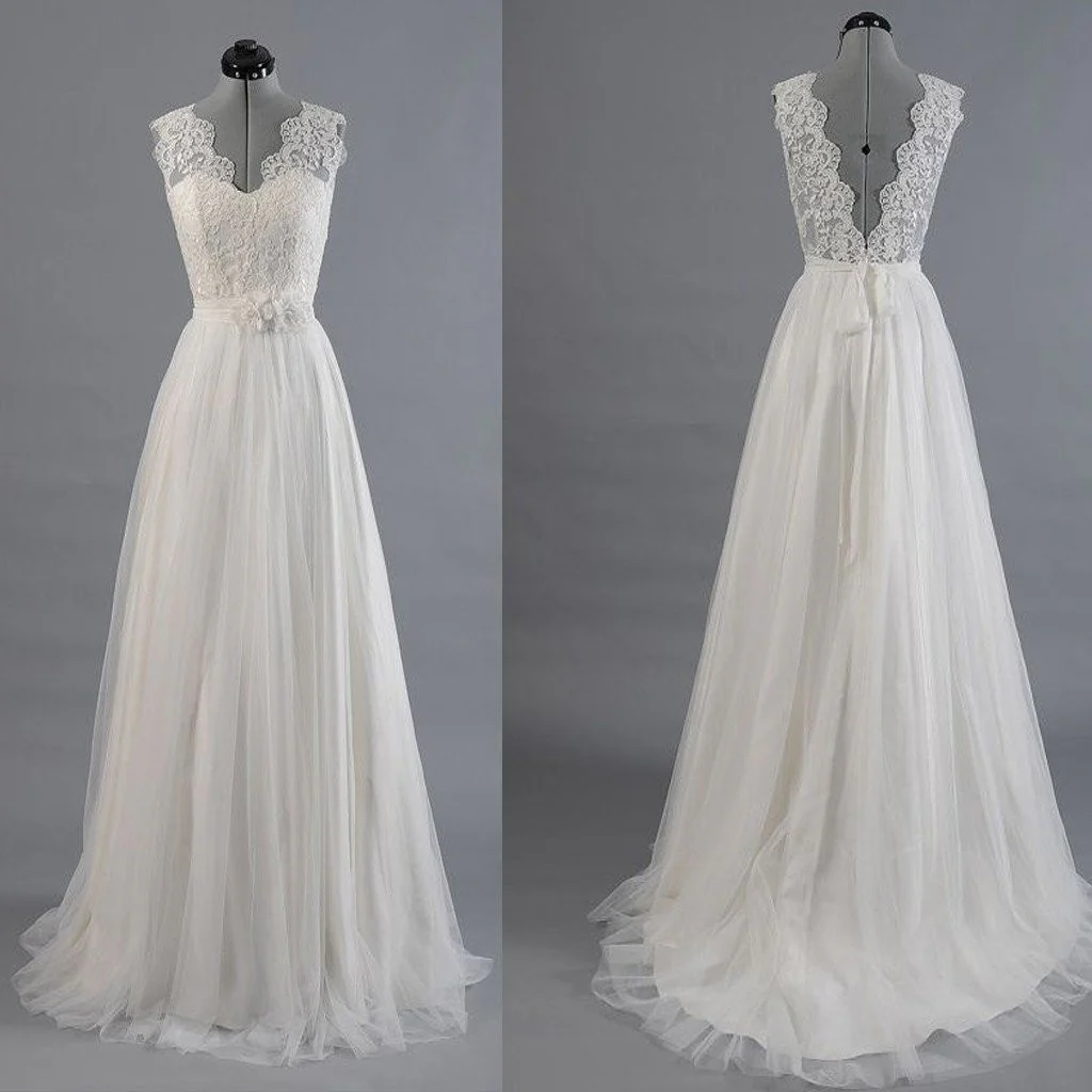 En magisk V-ringad bröllopsklänning med en sagolik charm, med en härlig spetstopp som flyter in i en elegant A-linje, prydd med en drömsk tyllkjol.