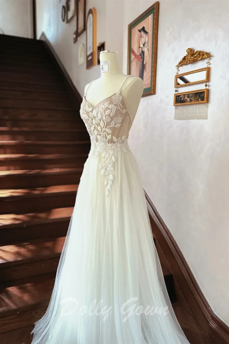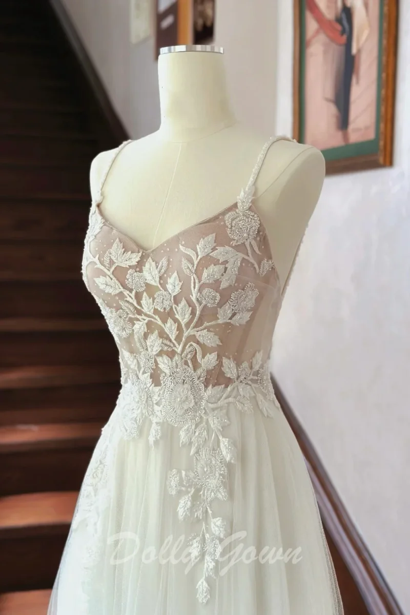 Elegant Flowy Tulle Beach Lace Top Fairytale Sheer Wedding Dress