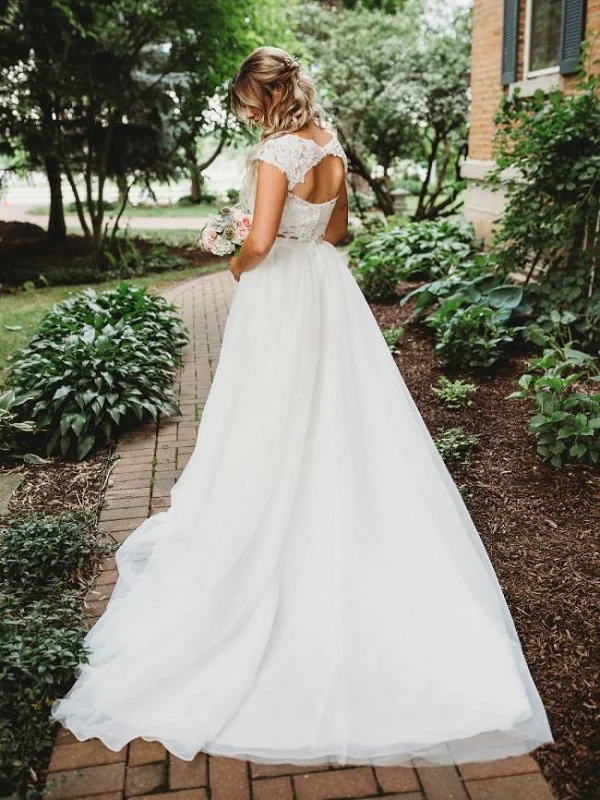 Fantastisk spets med öppen rygg Crop Top Tyllkjol Tvådelad bröllopsklänning
