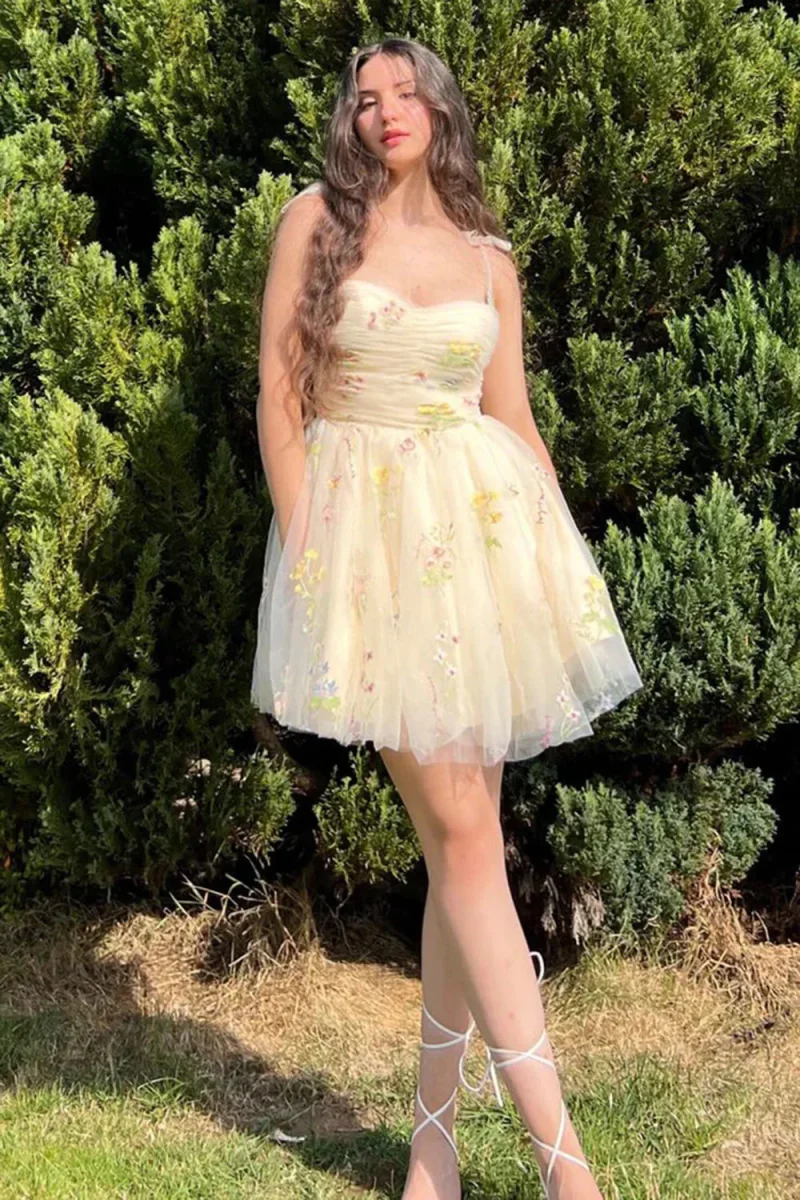 Float through your next special occasion in our champagne tulle homecoming dress. Delicate floral embroidery dances across the bodice and skirt. The spaghetti straps add a touch of playful charm. This short party gown is perfect for dancing the night away.