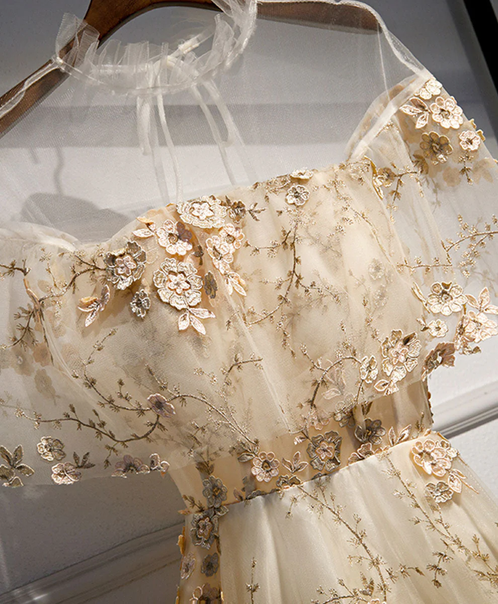Slip into this stunning champagne tulle lace long prom dress, featuring a breathtaking formal gown design. The delicate lace and tulle fabric create a romantic and whimsical atmosphere, perfect for a fairytale-like prom night. With its elegant long length and intricate details, this dress is sure to make you feel like royalty. Pair it with some statement accessories and get ready to turn heads at your special event.