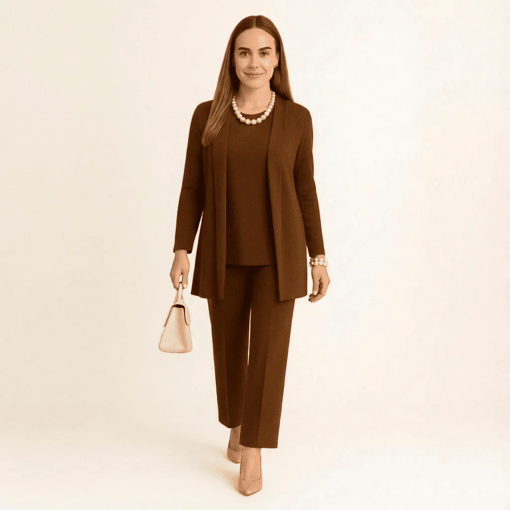 Detta set består av tre delar: cardigan, topp och byxor i en sammanhängande design. Delarna kan bäras tillsammans eller separat beroende på tillfälle. Setet passar för arbete, sociala tillfällen och vardag.