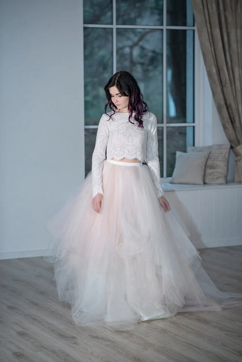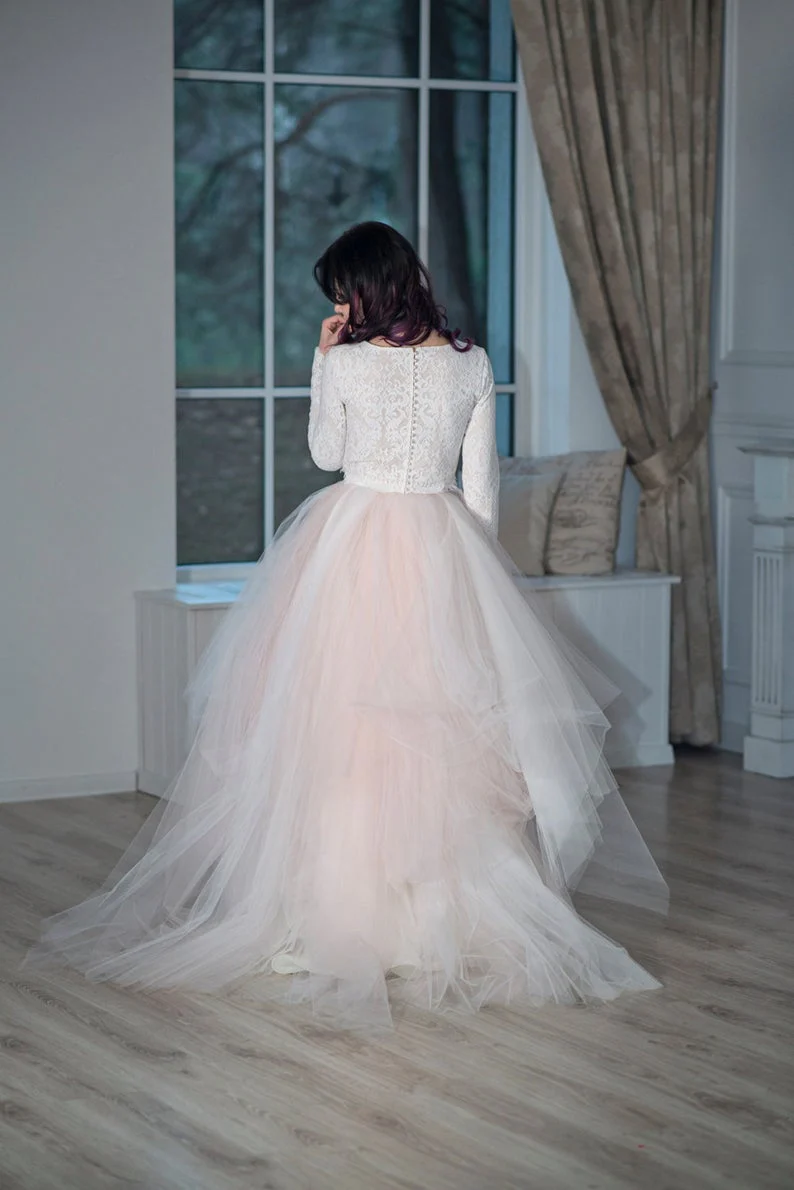 Bateau Neck Spets Lös Top Asymmetrisk Tyll Kjol Bröllop Separat Klänning