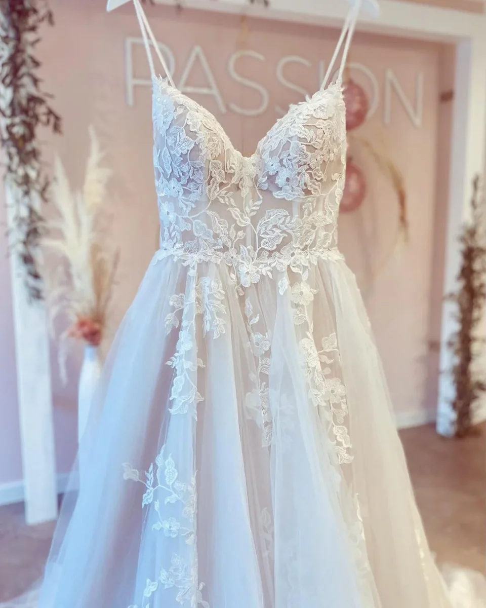 Make a statement on your special day with this elegant A line wedding dress. This gown features a flattering V neckline and a daring backless design. Crafted from delicate tulle and adorned with intricate lace embellishments, it exudes romantic charm and sophistication. The chapel train adds a touch of grandeur for a truly memorable walk down the aisle.