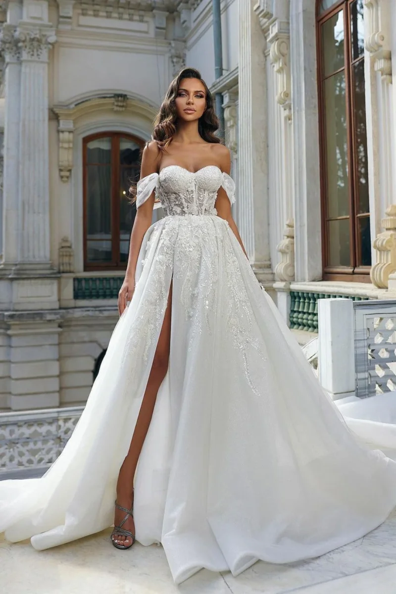 Fall in love with this elegantly designed A line wedding dress. Featuring a sweetheart neckline and delicate lace appliques, this dress is sure to make you feel like a princess on your special day. It has a sweep train and button back ensuring a perfect fit and a memorable entrance.
