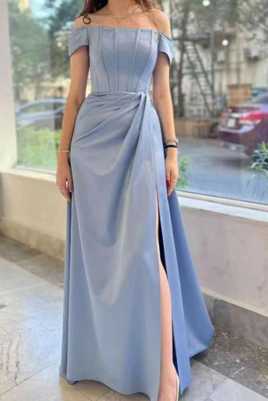 Dazzle at your prom in this stunning dusty blue gown! This elegant off shoulder dress features eye catching pleats and a flirty thigh high split. Perfect for making a memorable entrance, it’s designed to flatter your figure and keep you comfortable all night long. Dance the night away in style!