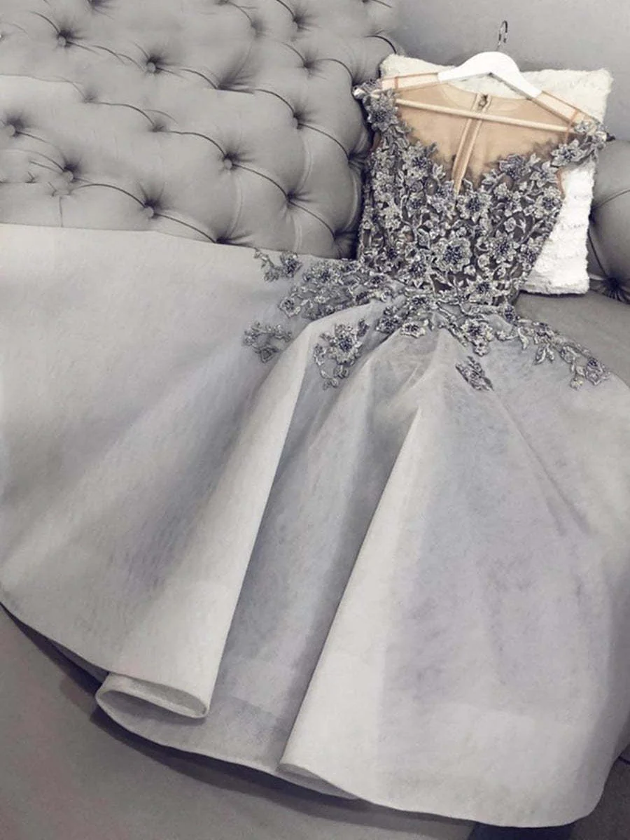 Twirl into any event with this chic A line dress, featuring delicate gray floral lace that’s sure to turn heads. Its comfortable round neck and short cut make it perfect for dancing the night away. This dress is a delightful choice for prom, graduation, or any homecoming celebration, blending playful charm with sophisticated grace. Prepare for compliments and dazzling memories in this enchanting ensemble!