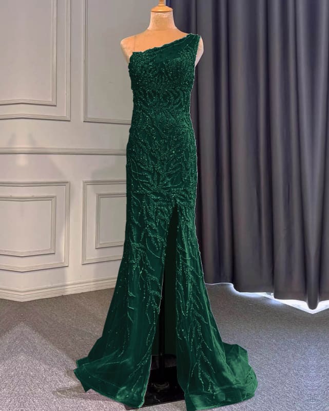 Twirl into your next grand event in this enchanting light purple mermaid gown! It features a chic one-shoulder design and intricate beading that shimmers with every move. The playful front split and cascading ruffles add a touch of whimsy, making you the belle of the ball. This dress is simply perfect for making a memorable entrance.