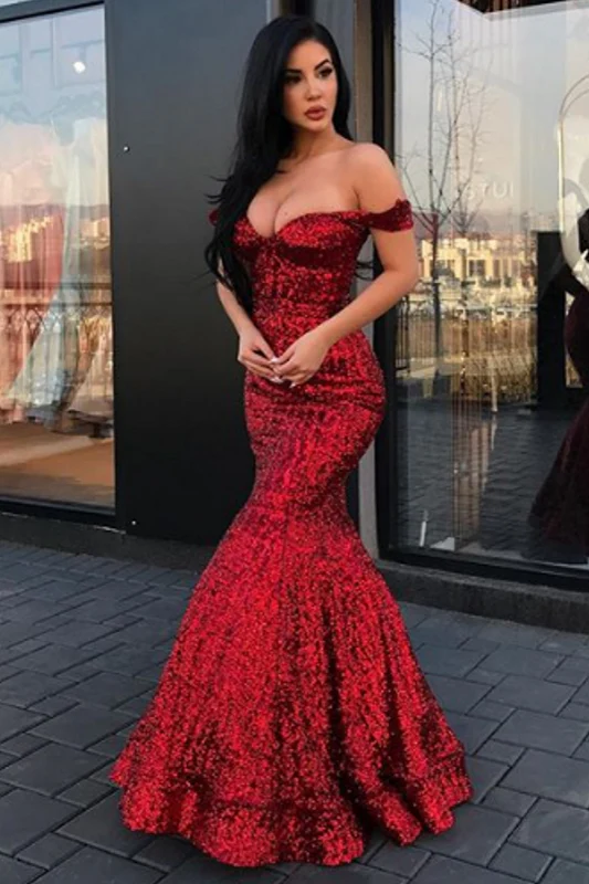 Shine bright in this stunning off the shoulder mermaid prom dress, designed to make you the star of any event. Adorned with shimmering sequins, this gown offers a luxurious and captivating look. Its flattering silhouette hugs your curves, creating an unforgettable and elegant presence. Get ready to dazzle and dance the night away in pure style.