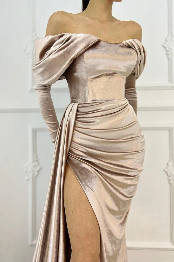 Make a lasting impression at your next formal event in this beautiful off the shoulder mermaid prom dress. Featuring long sleeves and a daring slit, it’s designed to turn heads and make you feel like a queen. The dress is crafted to order, ensuring a perfect fit whether you select a standard size or provide your custom measurements. Prepare to dance the night away in a dress that’s as unique as you are!