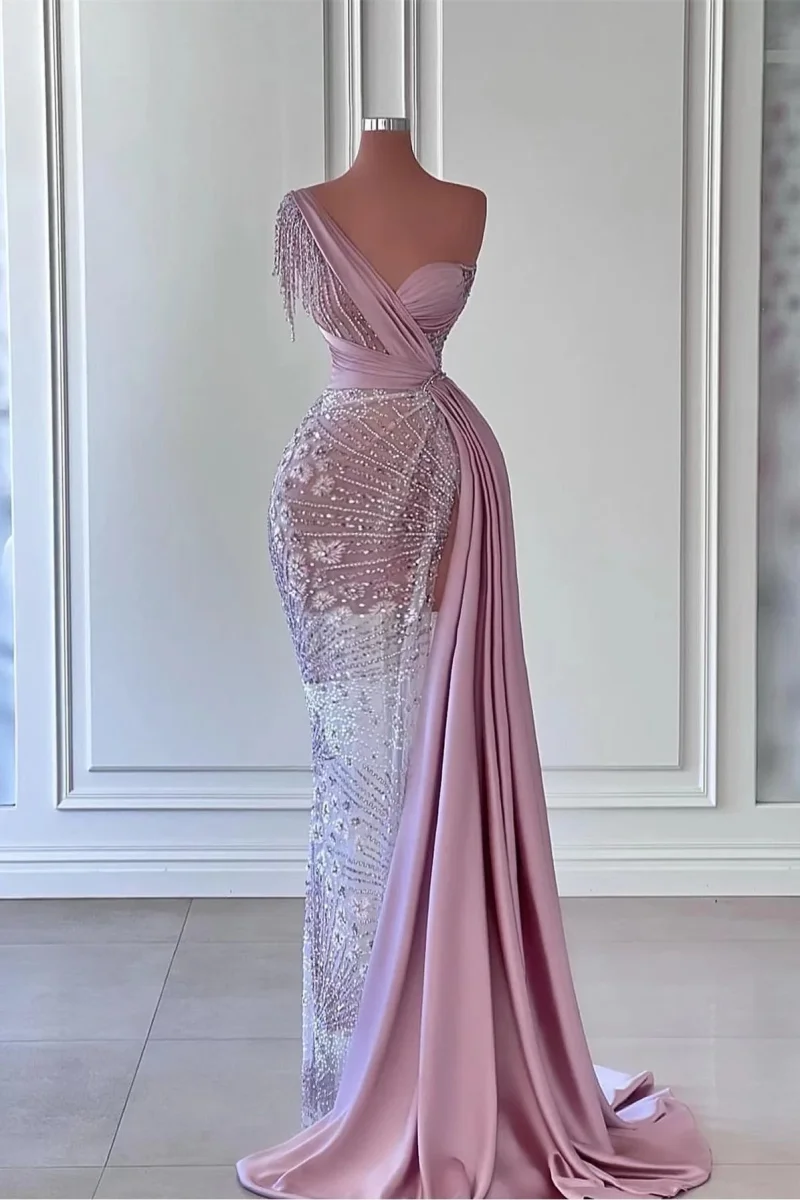 Step into the spotlight with this dazzling mermaid prom dress, designed to make heads turn. Its captivating one shoulder neckline and sophisticated split detail create a silhouette that’s both modern and timeless. Adorned with exquisite beadings, this gown shimmers with every move, ensuring you sparkle all night long. Perfect for any formal occasion where you want to leave a lasting impression.