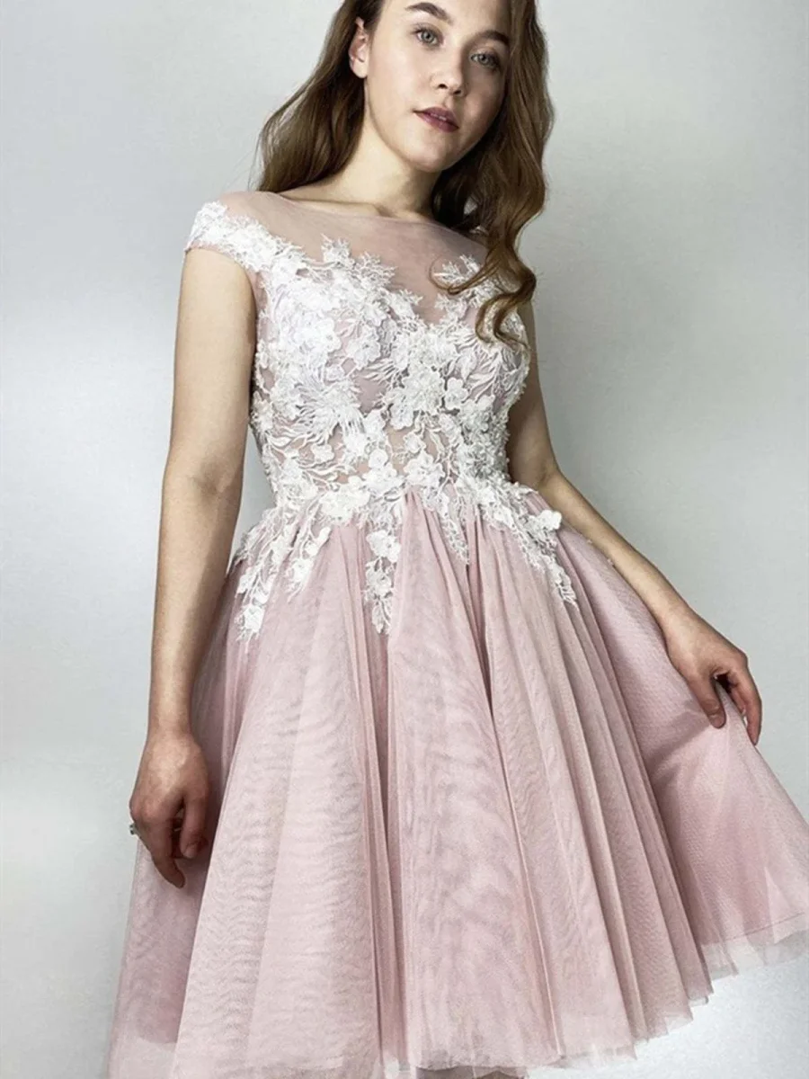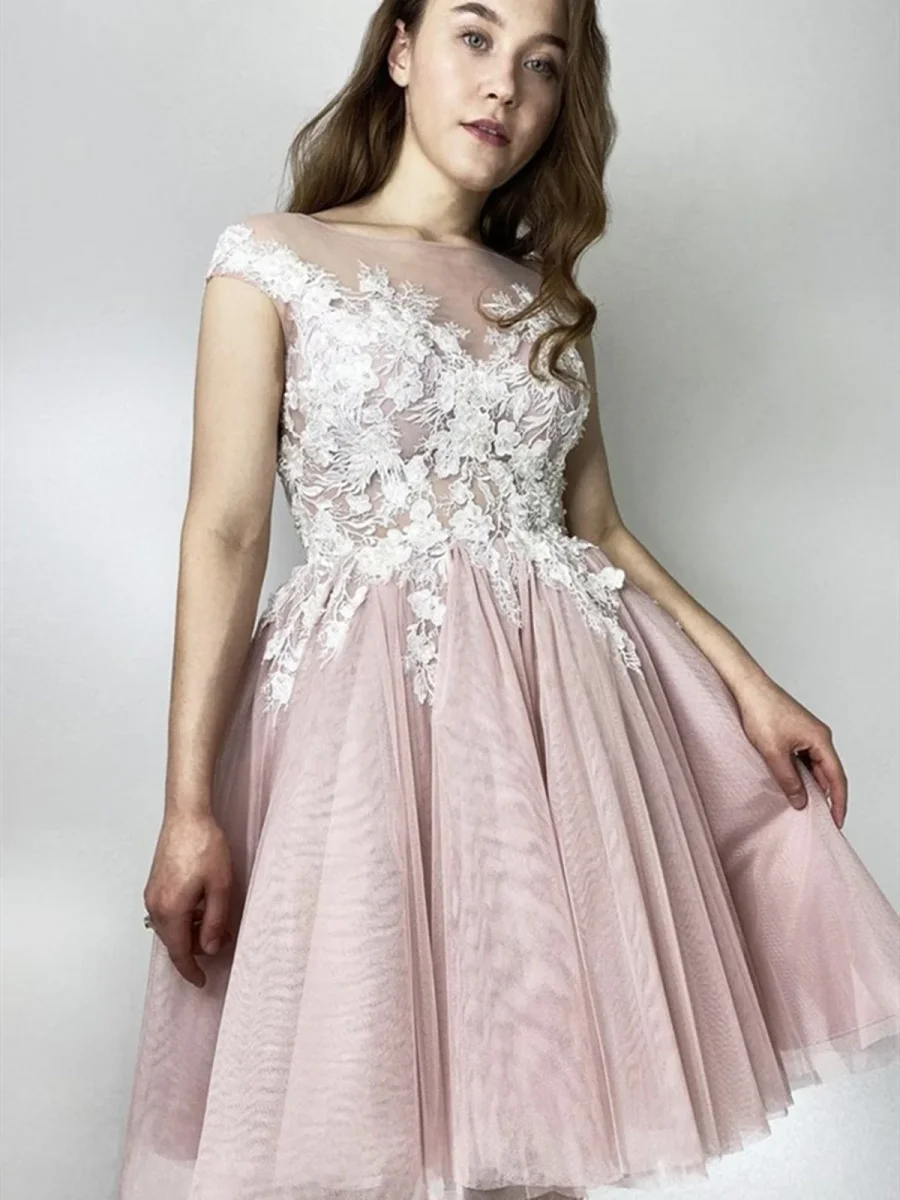 Twirl into your next special event with this delightful pink lace dress! Its charming cap sleeves and classic round neck create a timeless silhouette. Perfect for prom, homecoming, or any formal evening, this dress will make you feel like the belle of the ball. Prepare to dazzle and dance the night away in this enchanting design.