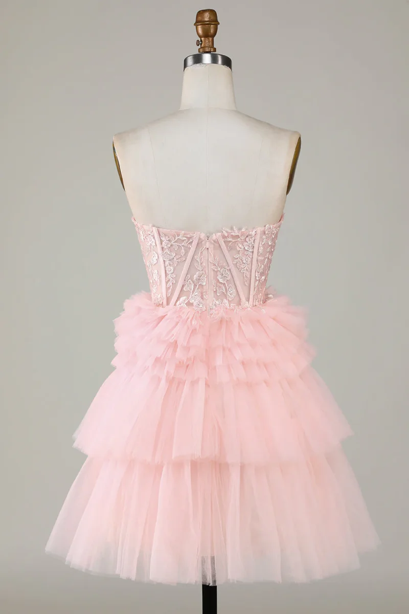 Step into the spotlight with this darling pink sweetheart dress! The A line silhouette and playful ruffles create a whimsical and unforgettable look. Perfect for homecoming or any special occasion where you want to twirl the night away. The delicate tulle and intricate detailing add a touch of elegance, ensuring you’ll be the belle of the ball.