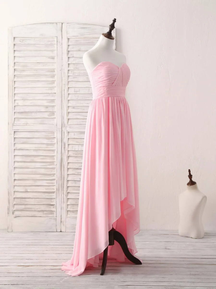 Twirl into your next event with this enchanting pink sweetheart chiffon dress, designed to make you feel like a dream. Its unique high low hemline adds a playful yet sophisticated touch, perfect for dancing the night away. Crafted from flowy chiffon, this dress offers comfort and effortless elegance. Get ready to capture hearts and unforgettable memories in this stunning gown.