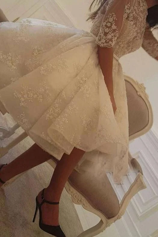 Step into your special day with this enchanting A line wedding dress, featuring a sophisticated jewel neck and delicate sleeves. Adorned with exquisite tulle and intricate lace, this short dress offers a playful yet elegant silhouette. It’s the perfect choice for a charming and memorable celebration. Each dress is made to order, ensuring a perfect fit just for you.