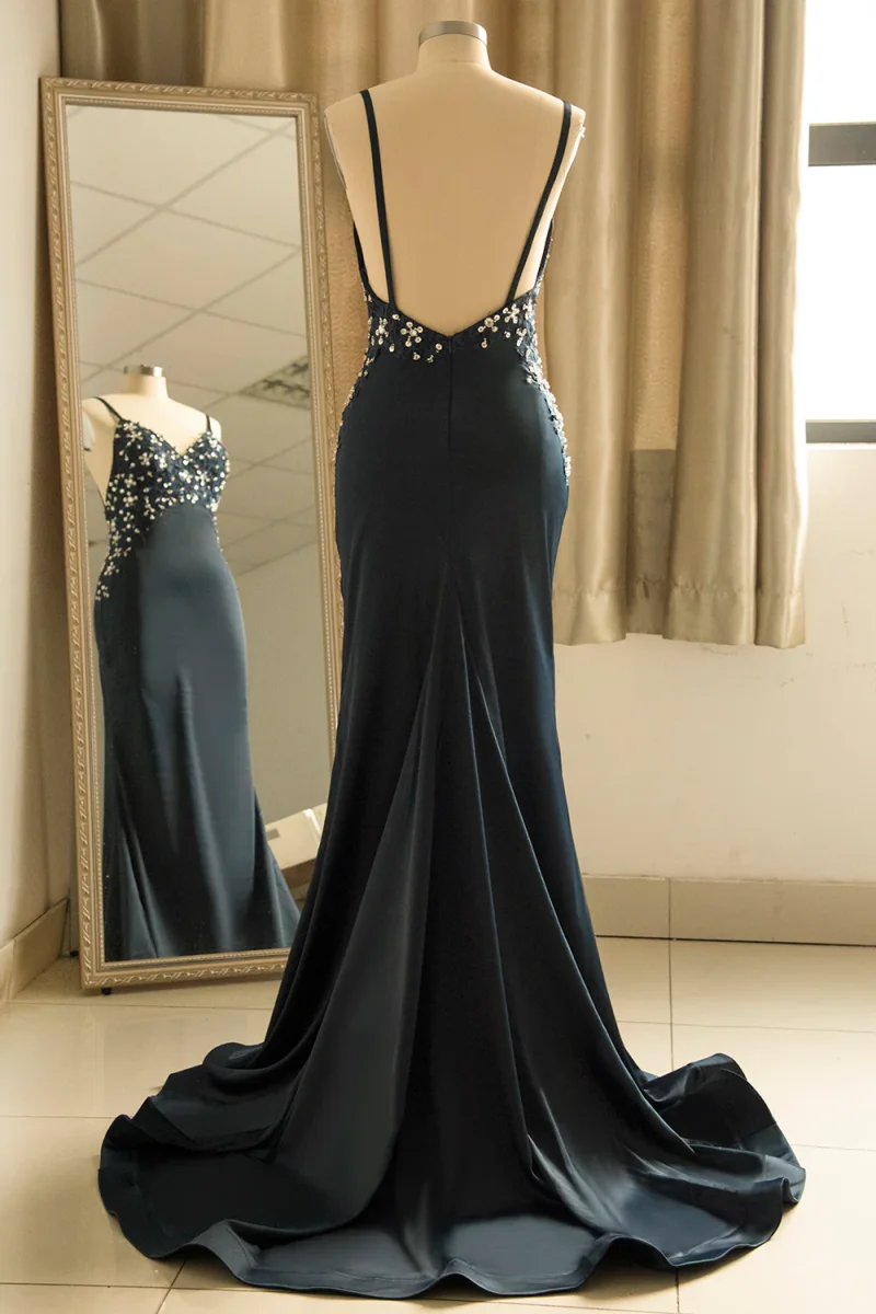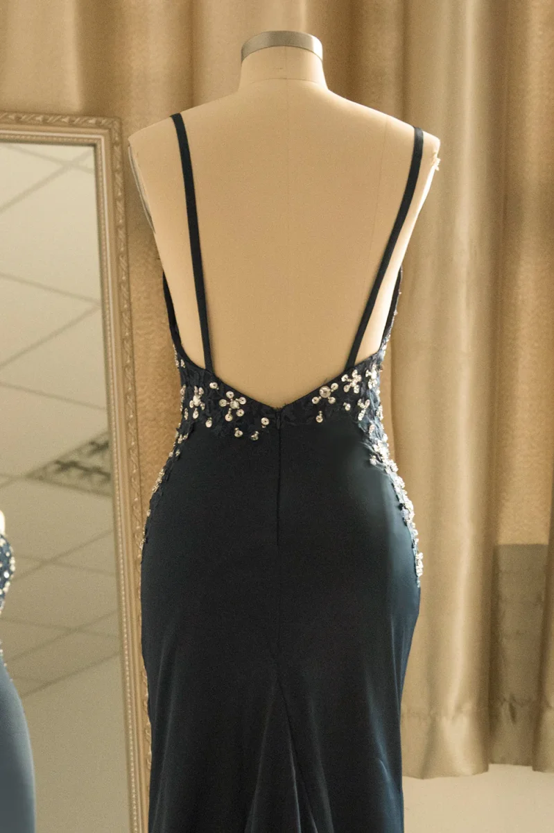 Glide into your next event with this enchanting mermaid gown, featuring delicate spaghetti straps and a flattering V neckline. Adorned with shimmering sequins, this dress promises to make you sparkle and shine. Its sleek silhouette hugs your curves, creating a stunning and elegant look perfect for any special occasion. Prepare to captivate and charm everyone in the room!