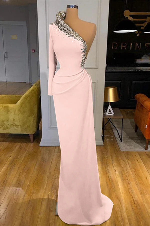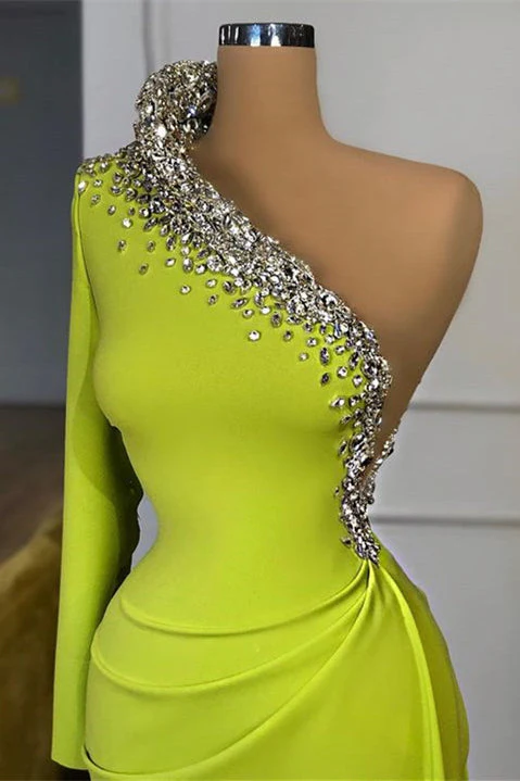 Make a statement at your next special event with this enchanting green prom dress. Featuring a flattering mermaid silhouette with a beaded, one shoulder design and long sleeves. This gown combines elegance and sophistication to create a memorable look that will turn heads. Perfect for prom, galas, or any formal occasion where you want to shine.