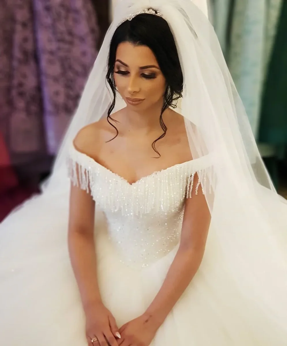 Feel like royalty on your special day in this exquisite off the shoulder wedding dress. The delicate beading and tassel details add a touch of glamour, while the tulle fabric creates a dreamy, princess-like silhouette. The backless design adds a hint of allure, making it perfect for a modern bride. Let this dress be the start of your happily ever after.