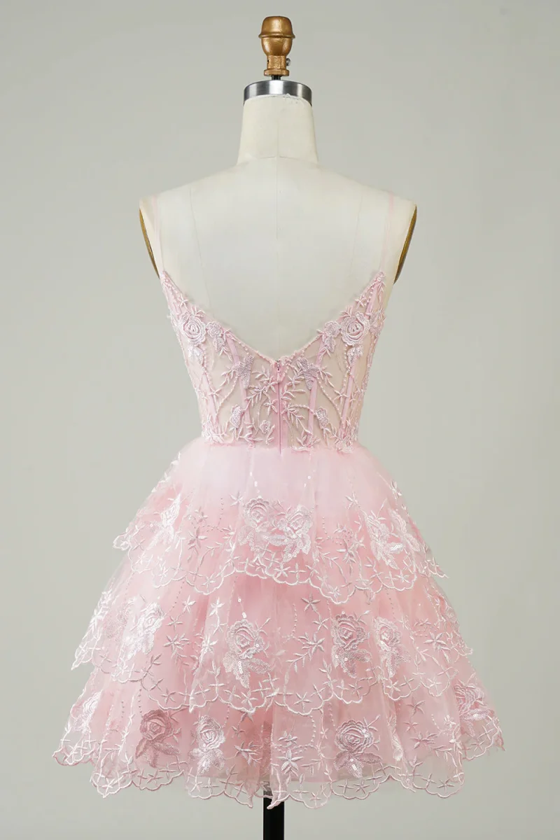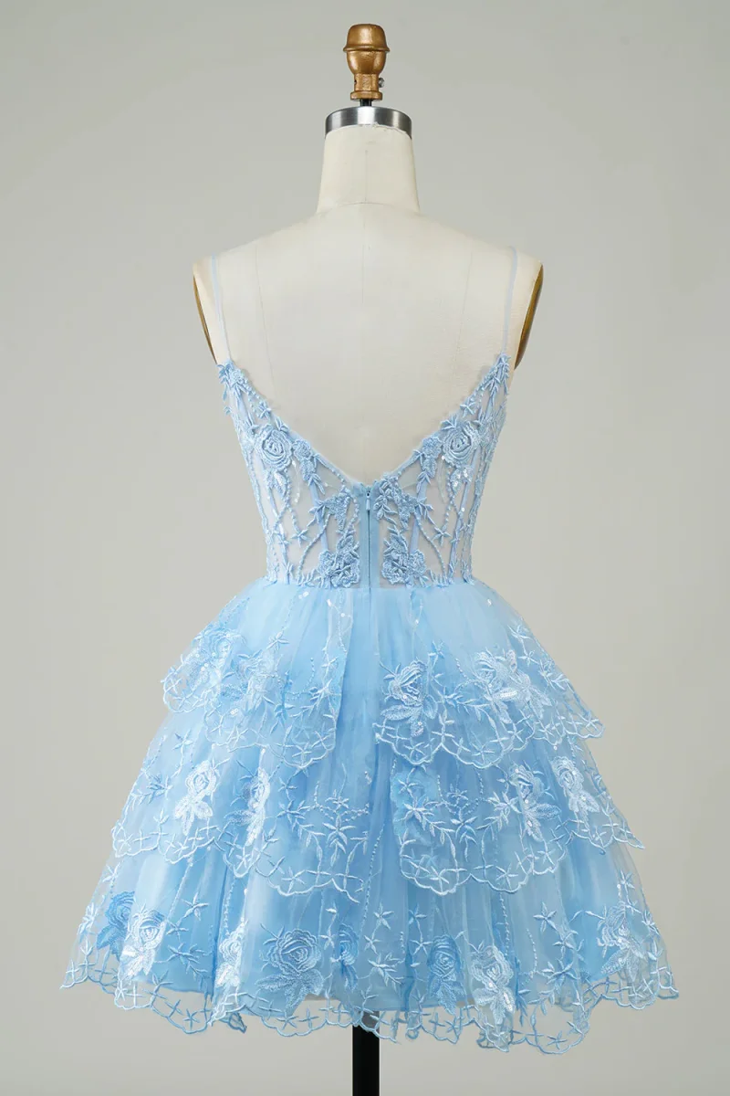 Unleash your inner glam with our Glitter Lace Corset Ruffle Tiered Short Homecoming Dress! The sheer corset bodice and spaghetti straps add a flirty touch, while the ruffle tiered skirt adds a playful bounce. The perfect dress for homecoming or any dance, guaranteed to make you stand out and feel confident all night long!