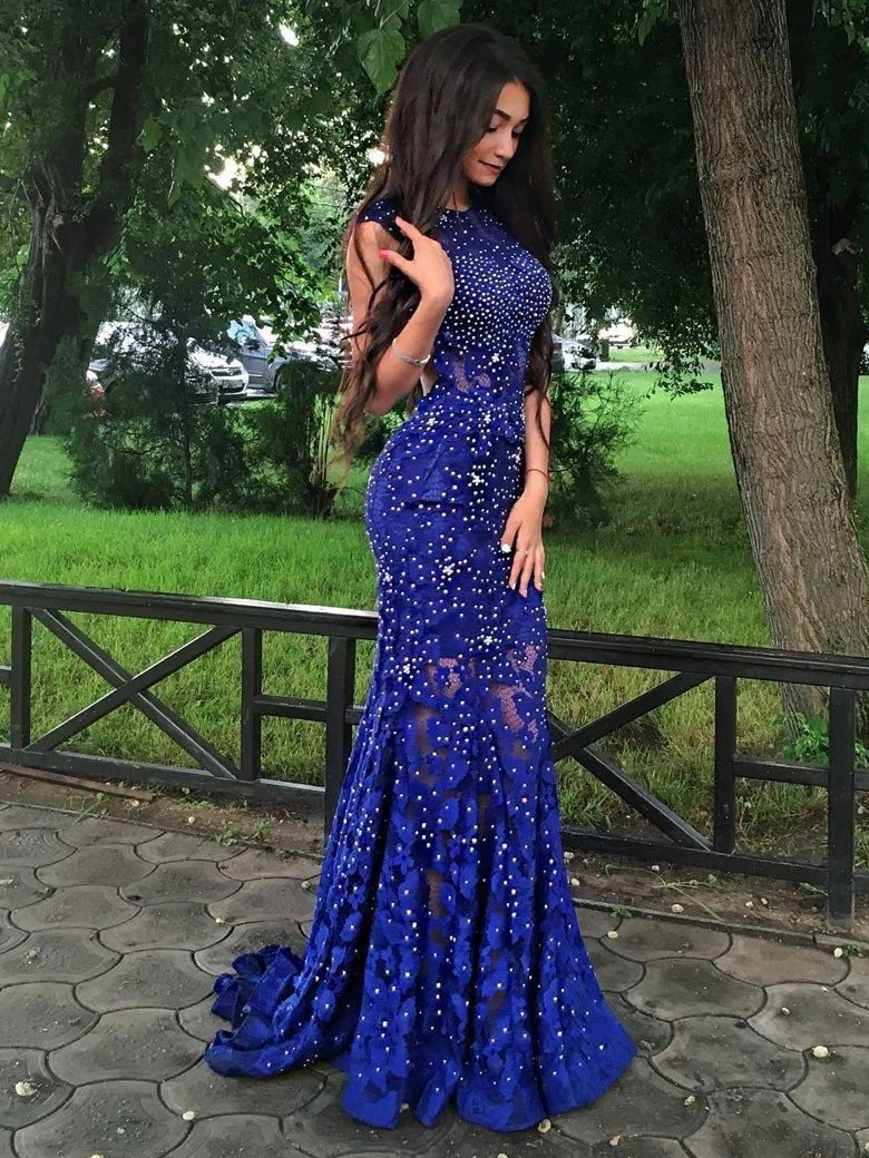 Glittrande öppen rygg Spets Royal Blue Mermaid Balklänning