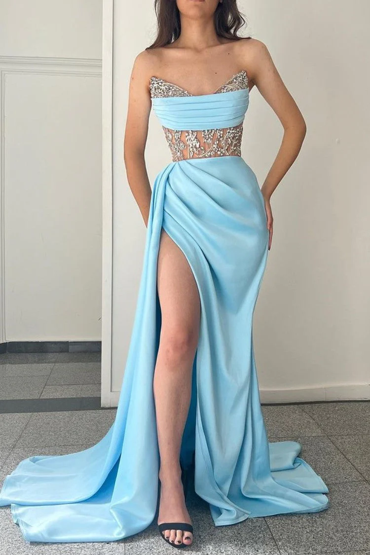 Glide into your next grand event in this stunning sky blue mermaid gown. Adorned with delicate beadwork and a chic split, this dress guarantees all eyes will be on you. Crafted for a perfect fit, it’s ready to make your special occasion truly unforgettable. Prepare to dazzle and delight!
