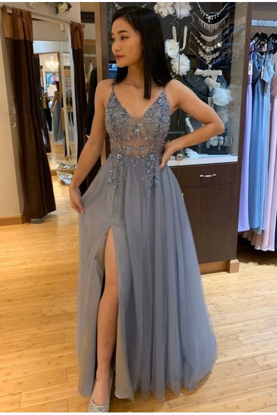 Glamorös V-ringad skir spaghettirem Slit Bead Balklänning