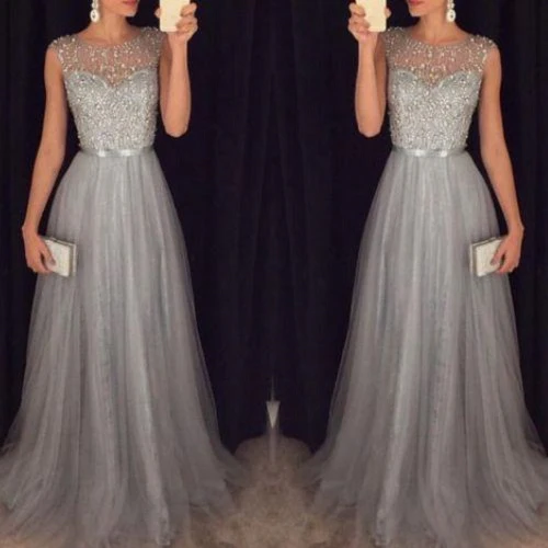Illusion Neck Spets Bead Top Ljusgrå balklänning