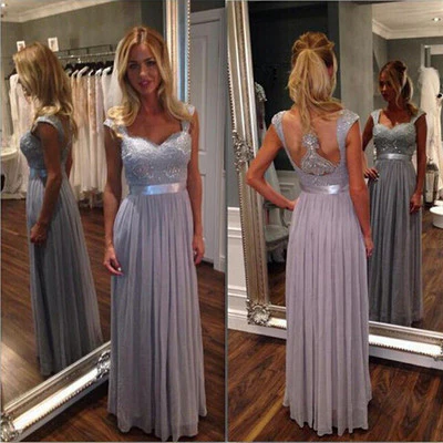 Keps ärm Spets Topp Grå Chiffong A-linje långa brudtärna klänningar