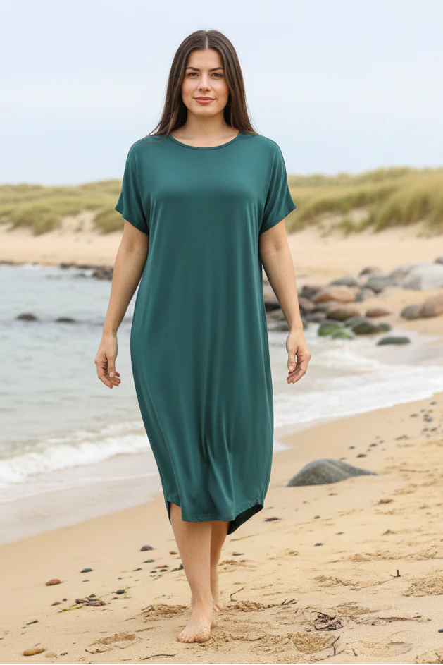 Grön klänning Eveline Dress Smokepine Green är en fantastiskt skön och stilren klänning i mjuk viskos med ett vackert fall. Den har en avslappnad passform med vida ärmar, U-ringning och en elegant knappöppning i nacken.