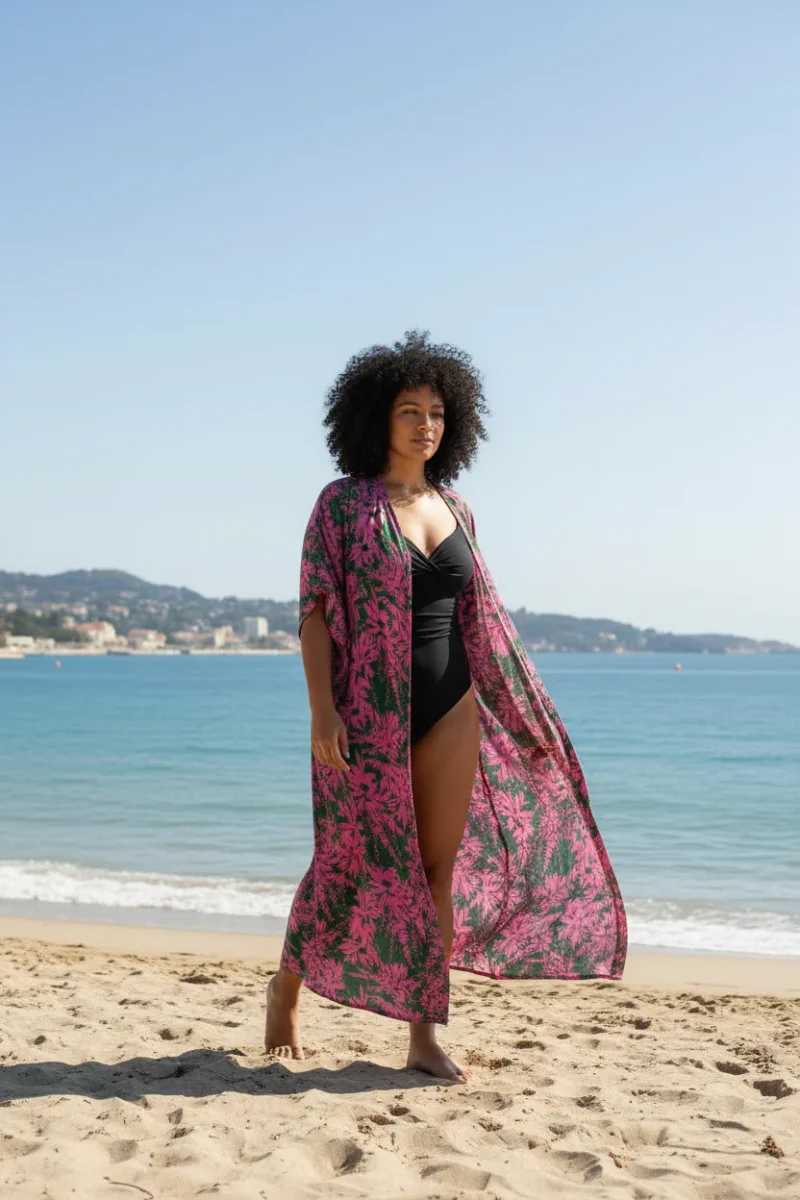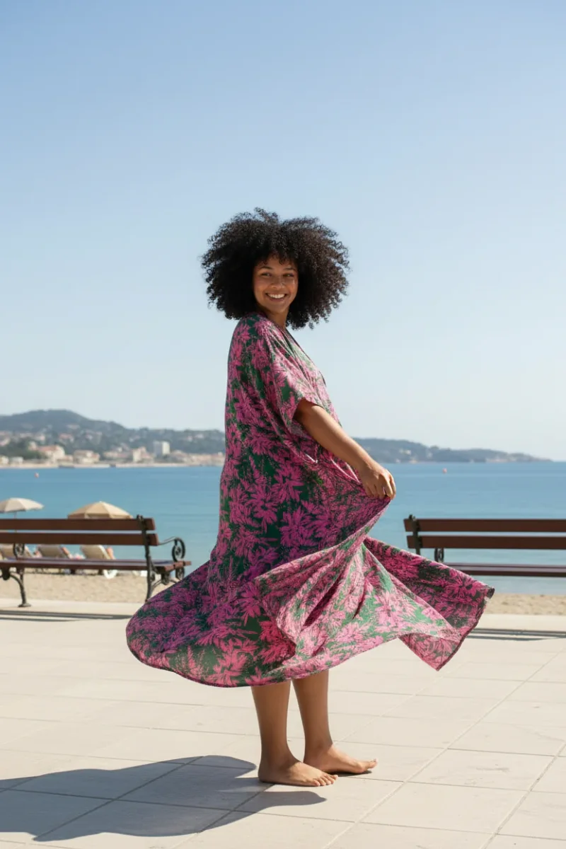Supereleganta kaftanklänningen Flower Sea Dress – en ny favorit från Hängmatta! Upptäck vår löst sittande och underbart böljande kaftanklänning med knappar hela vägen ned framtill. Ett stilrent och härligt plagg som kan bäras som klänning, kimono eller något däremellan. Perfekt som strandklänning men också snygg nog att bära till kvällens festligheter. Passar utmärkt med skärp i midjan! Tillverkad av 100% mjuk viskos för maximal komfort.