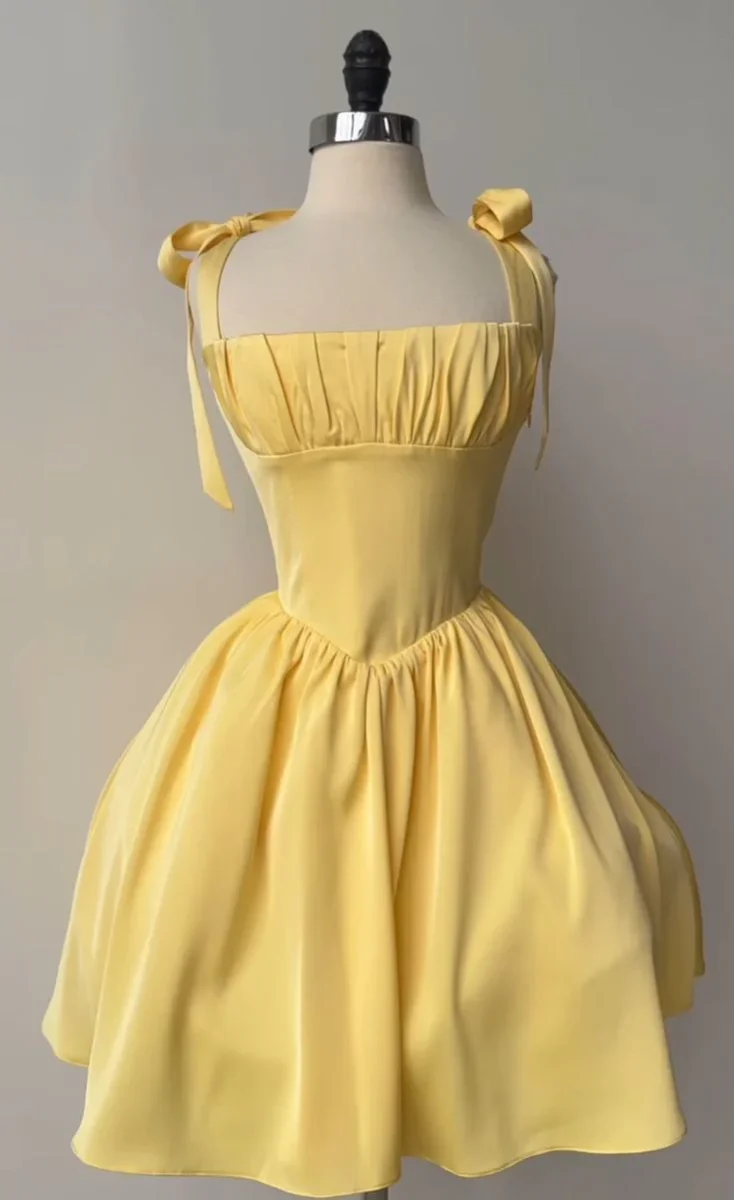 Denna gula A-linjeformade homecoming-klänning i satin har en dekorativ rosett och snörning bak för en justerbar och säker passform. Den strukturerade överdelen har en inbyggd bh för smidig formning och bekvämt stöd. Lätt satin faller samman i en smickrande, utsvängd kjol som rör sig graciöst för dans och foton. Anpassade storlekar finns tillgängliga för en skräddarsydd passform vid behov.