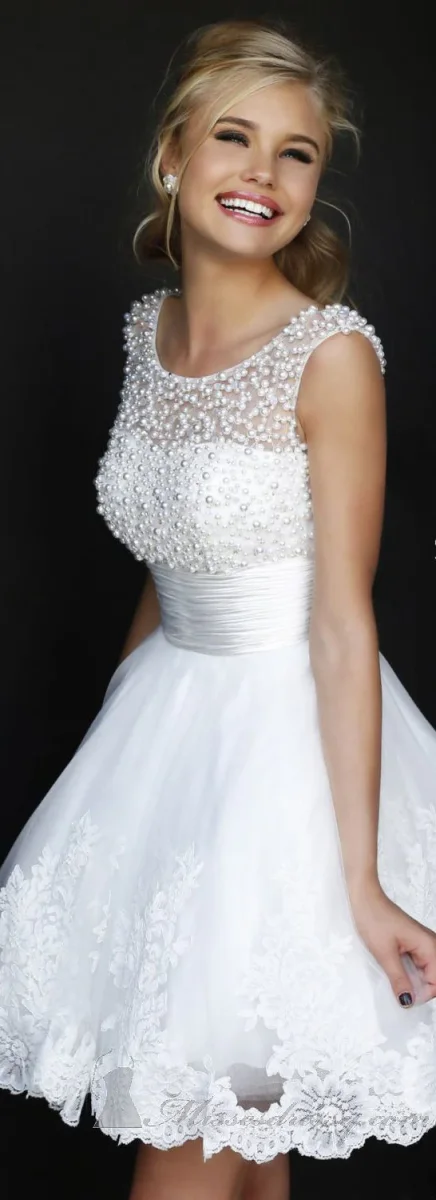 Pärla kort knälång bröllopsklänning med spets applikation nederkant