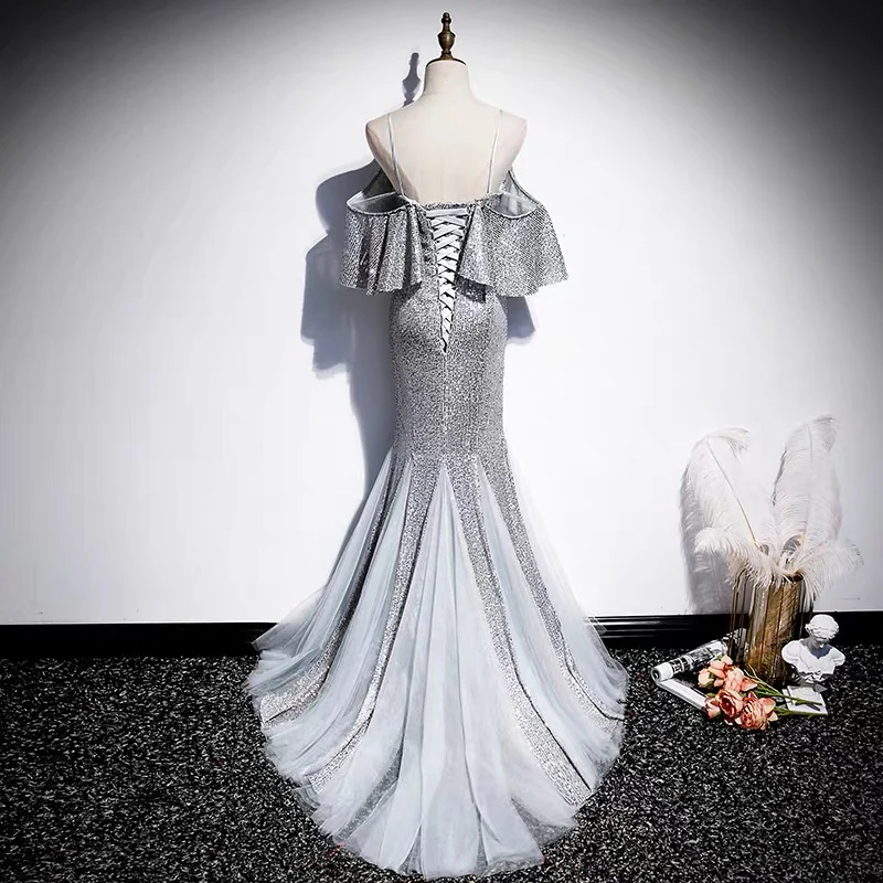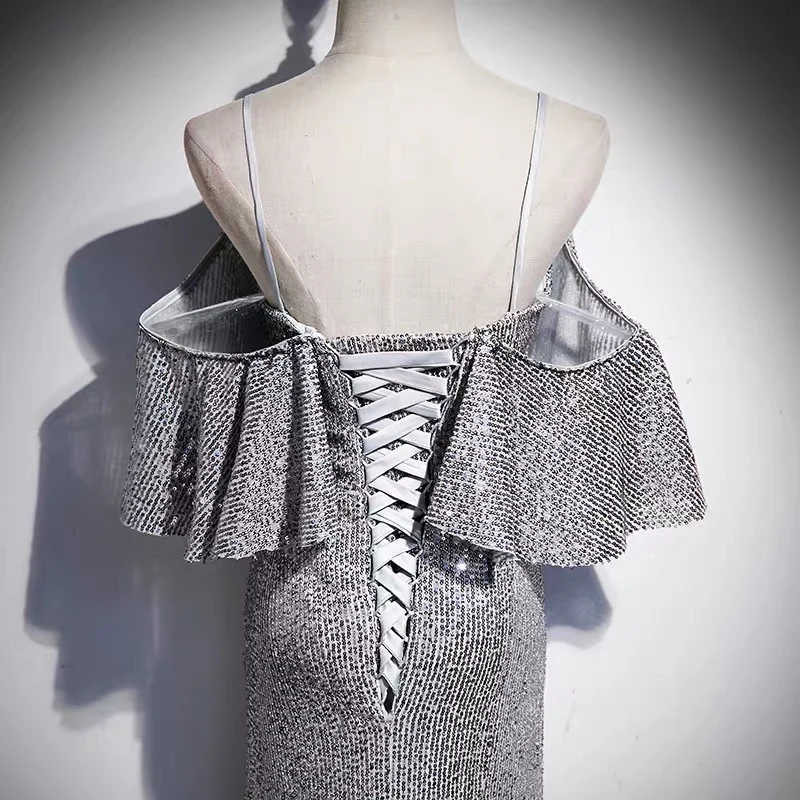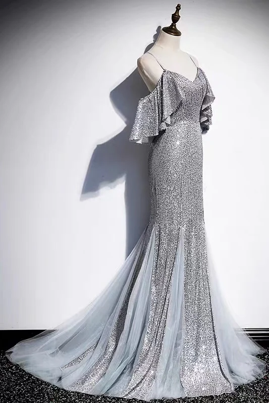 Off the Shoulder Silver Paljetter Mermaid balklänning med spaghettiband.
