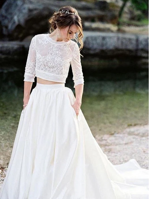 Spets Topp 3/4 ärmar satinbotten Brudseparerar.
