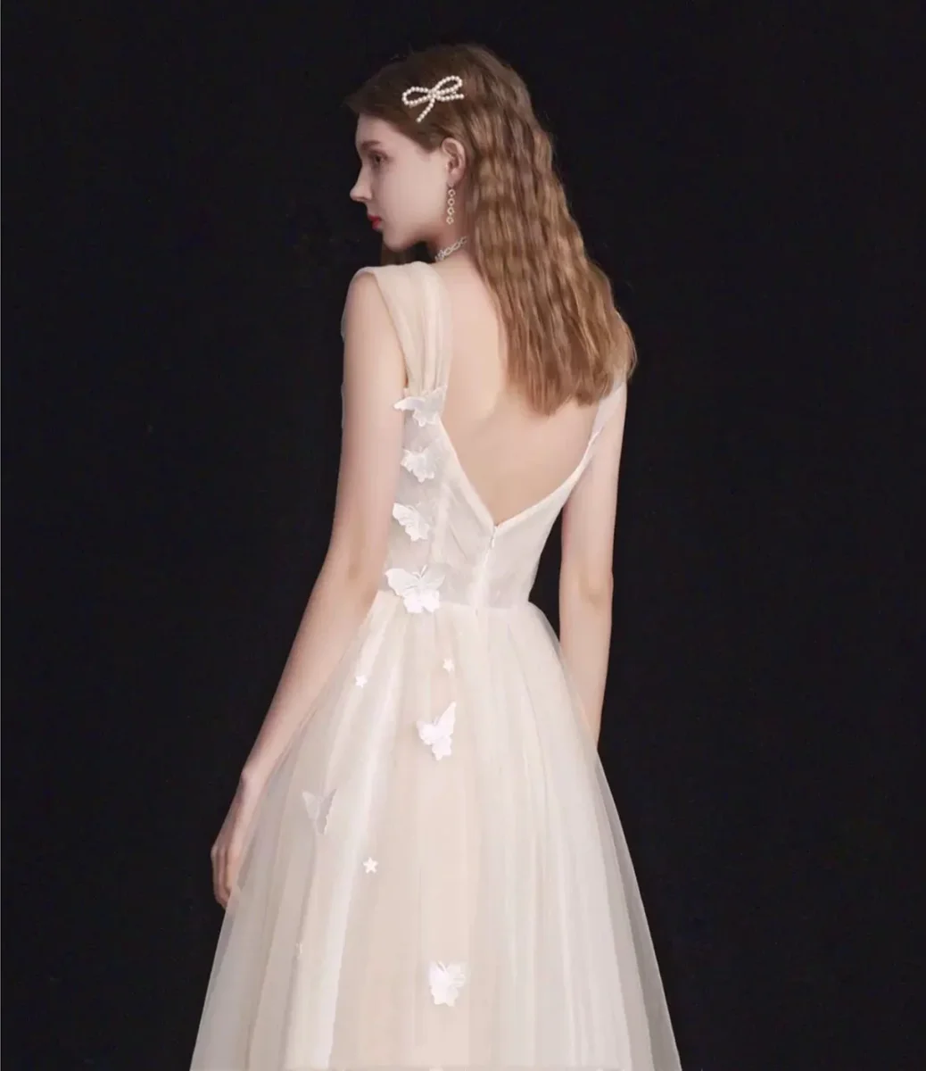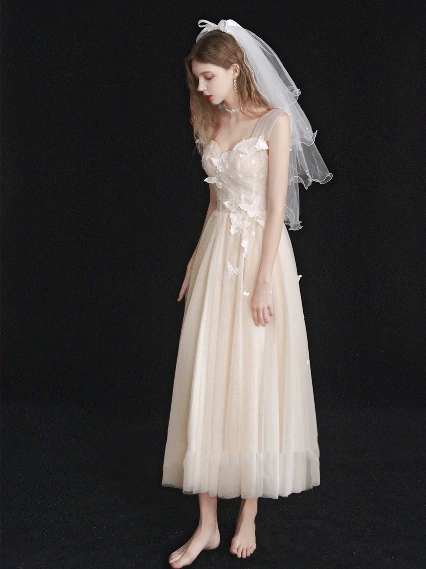 New Arrival 50s Style Light Champagne Tea Length Bridal Gown Trimmed with Delicate Butterflies on Top