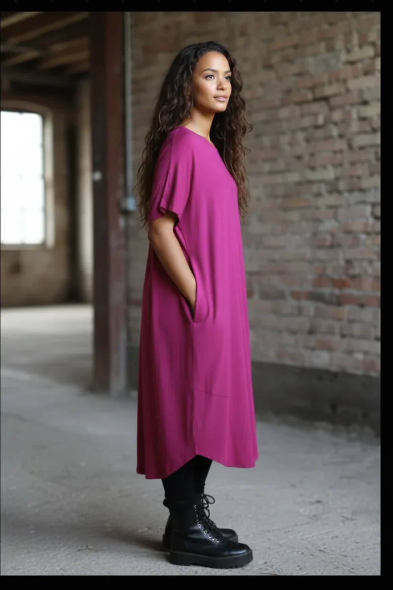 Denna eleganta och bekväma klänning passar både till vardags och festliga tillfällen. Tillverkad av ett mjukt, sval och superstrechig viscose. Den ger en skön känsla mot huden och en smidig passform. Modellen är one size, vilket gör den flexibel och lätt att använda för olika kroppstyper.