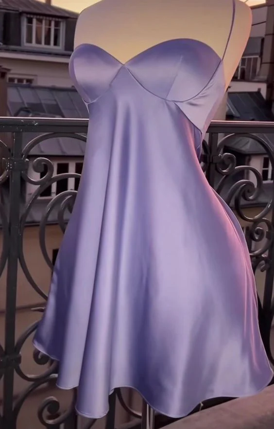 Mjuk A-linjeformad satinsilhuett smickrar midjan och faller ner i en lekfull kort kjol som är perfekt för homecoming- eller cocktailtillställningar. Den ärmlösa skärningen och dragkedjan bak ger en ren och säker passform, medan den inbyggda bh:n ger bekvämt stöd. Finns i lila eller specialfärgade modeller med amerikanska storlekar 2–16 eller anpassade mått för en skräddarsydd passform. Helfodrad, lättviktig konstruktion och lättskött tyg gör den här klänningen enkel att bära och underhålla.