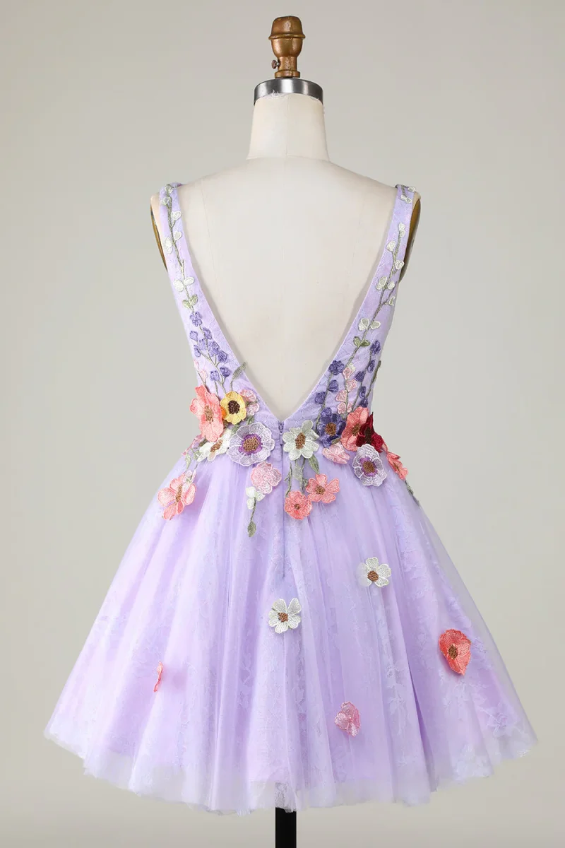 Get ready to make a statement with our 3D Floral V-Neck Backless Homecoming Dress in Lavender! This stunning dress features intricate 3D floral lace that adds depth and texture, while the plunging neckline and back add a touch of allure. The A-line silhouette is perfect for a flattering fit, making this short homecoming dress a must-have for any special occasion. Don’t miss out on this beautiful and unique piece!