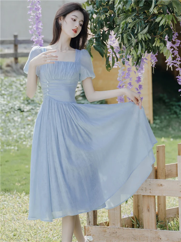 Den här sommarklänningen i chiffong har en fyrkantig urringning, vilket ger en touch av elegans till den övergripande designen. Det passande livstycket och en utsvängd kjol som graciöst svajar när du rör dig.