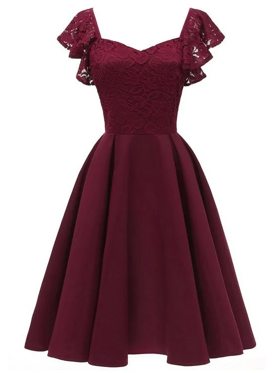 Vinröd 50-tals stil med volanger, korta brudtärnaklänningar.