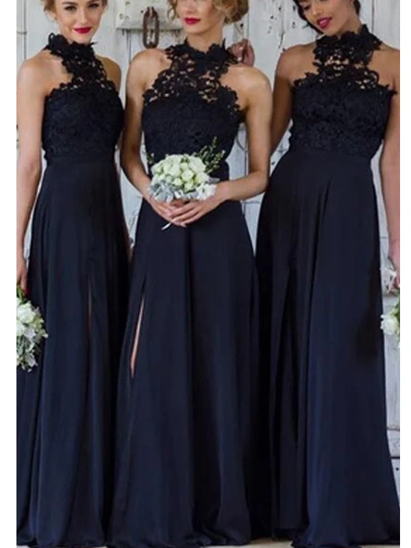 Långa Marinblå Spets Topp Grimma Brudtärna Klänningar.