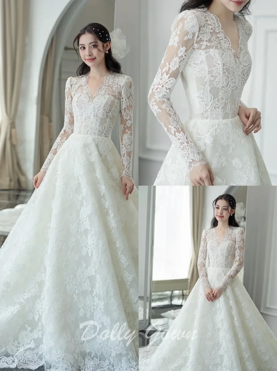Classic A-line Floor Length Bridal Gown with Long Sleeves Feautures High Quality Delicate Lace
