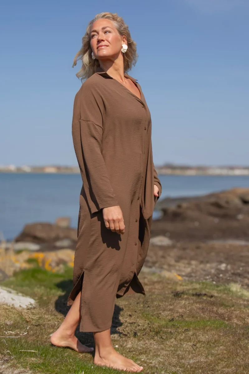 Sahara Longsleeve Klänning är tillverkad av 100% återvunnen polyester. Denna klänning är designad med långa ärmar, öppningsbara knappar fram och har en generös passform för olika kroppstyper. Med praktiska fickor kombinerar den stil och funktionalitet.