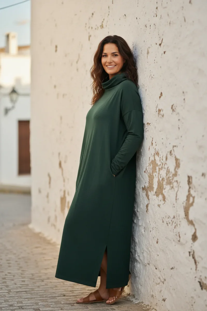 Suveränt snygg och bekväm långklänning med härlig polokrage. Polo Kaftan Dress är en av våra stora favoriter! Nu kommer denna sköna poloklänning i en mjuk och stretchig ekologisk bomull. Klänningen har en avslappnad passform med en lös och ledig polokrage och långa ärmar. Naturligtvis är den försedd med fickor!
