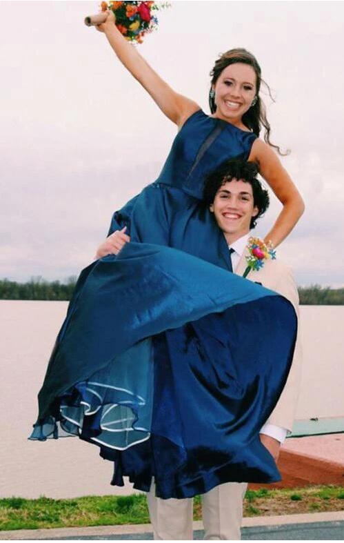Bateau Neck Marinblå Enkel A-linje balklänning.