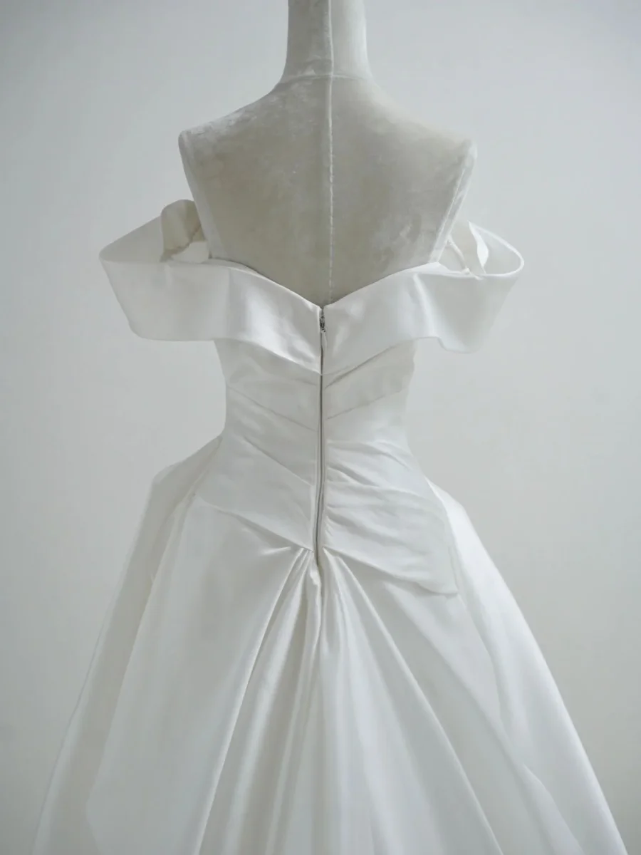 Asymmetrisk drapering från axeln. Bröllopsklänningar i rent siden