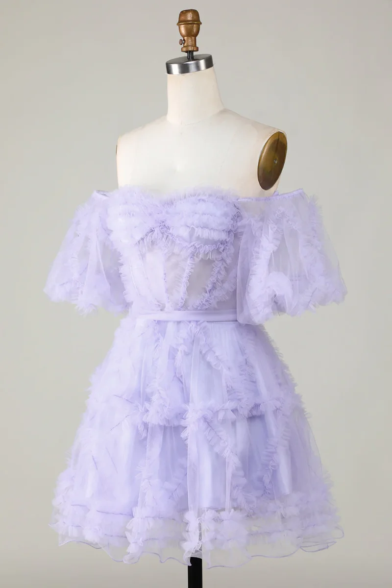 Step into the spotlight with this enchanting purple homecoming dress! The off the shoulder design and A line silhouette create a flattering and whimsical look. The corset bodice adds a touch of elegance, while the tulle skirt brings a playful, airy feel. Perfect for making unforgettable memories at your special event.