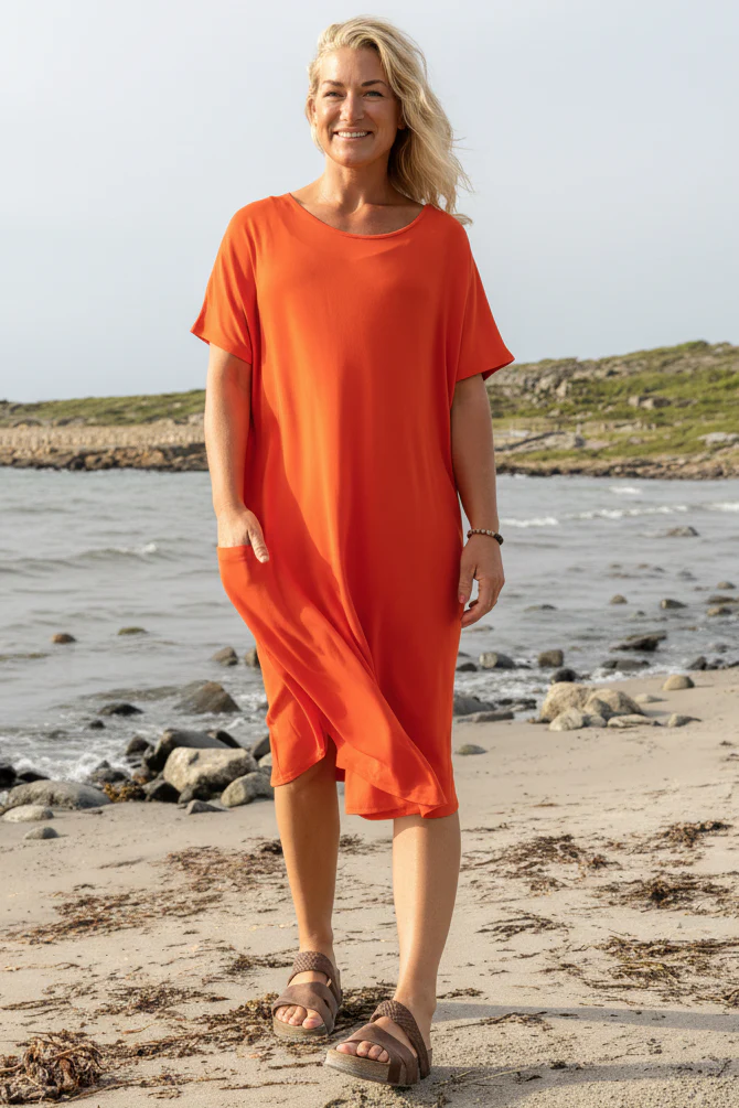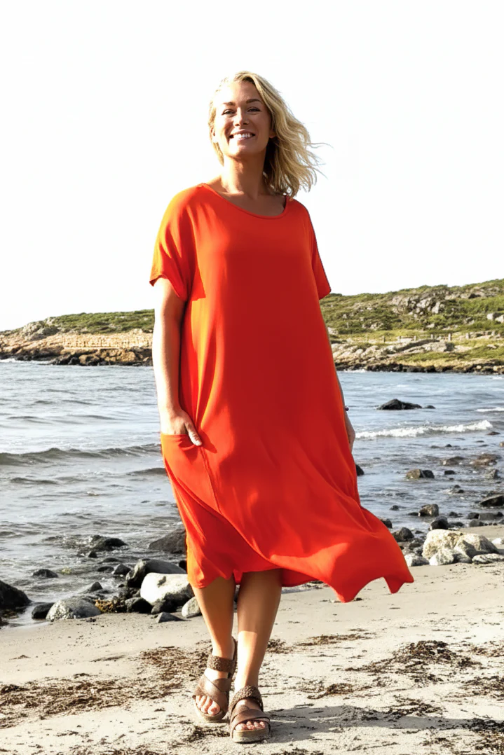 Denna eleganta och bekväma klänning passar både till vardags och festliga tillfällen. Tillverkad av ett mjukt, sval och superstrechig viscose. Den ger en skön känsla mot huden och en smidig passform. Modellen är one size, vilket gör den flexibel och lätt att använda för olika kroppstyper.